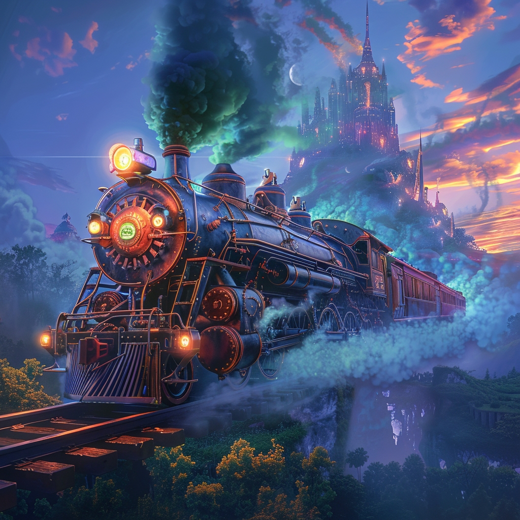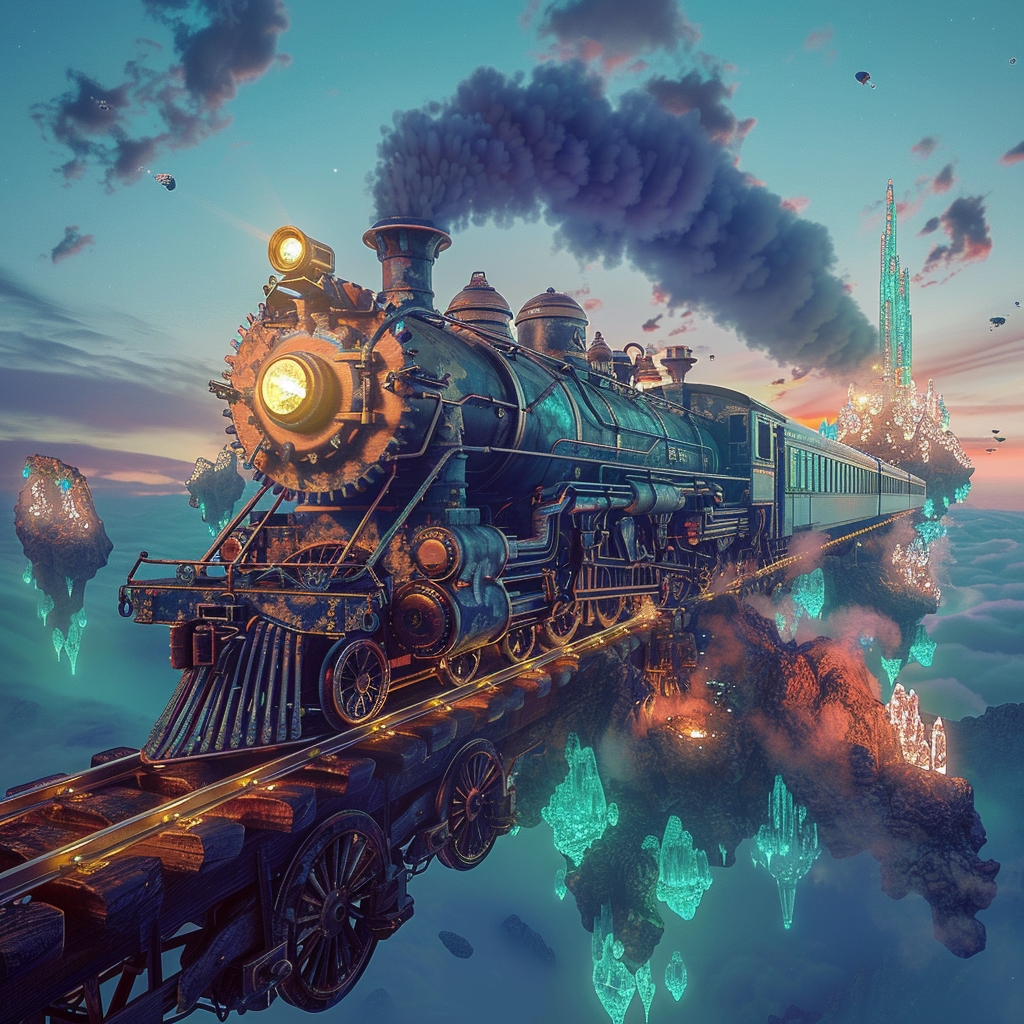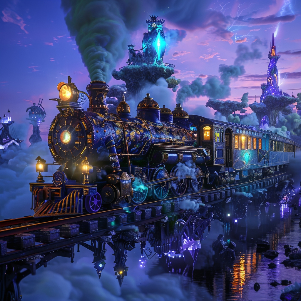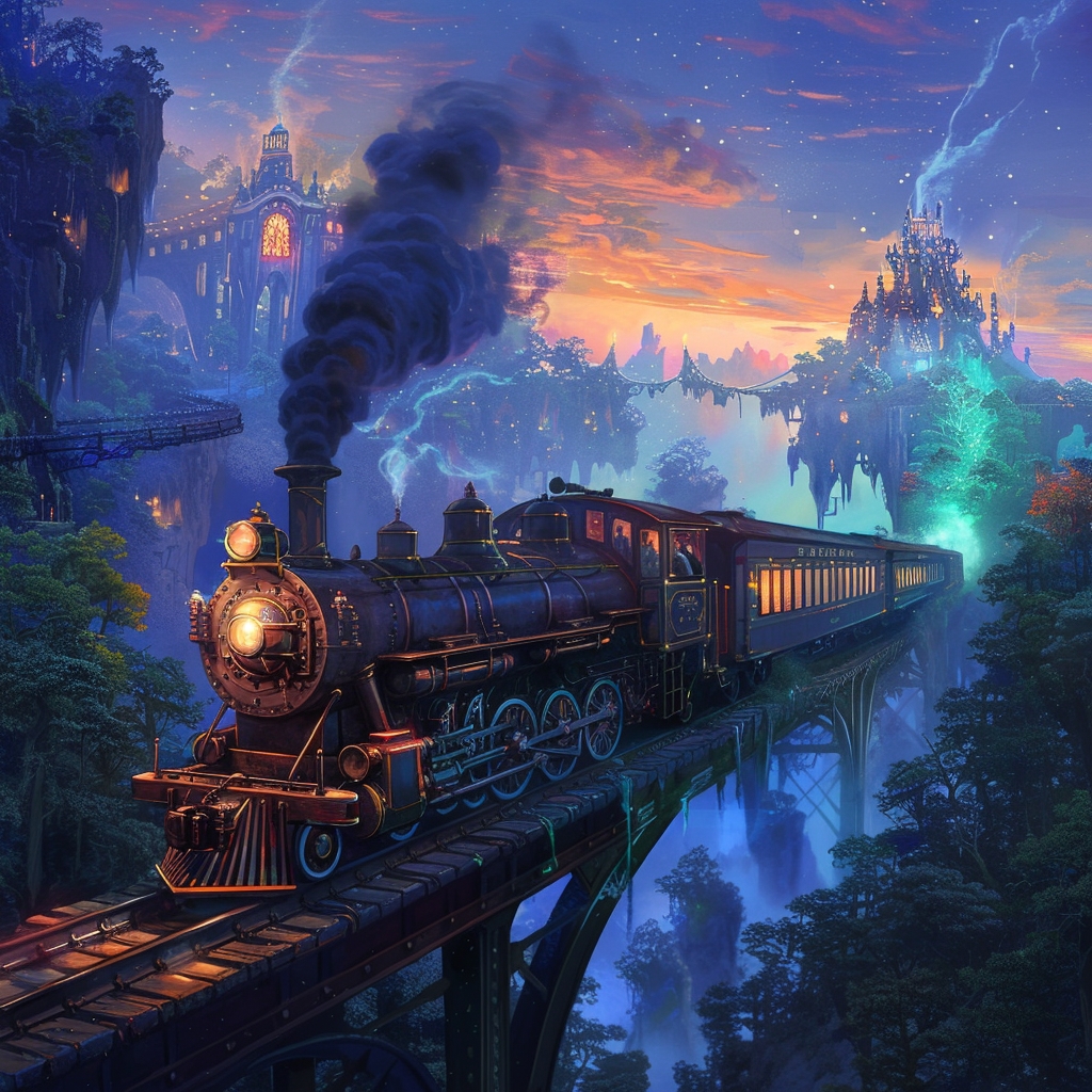 在一片蓝色的黄昏中,一列蒸汽朋克风格的火车正在穿越一个超现实的景观。想象这是一列由时光机研制出的火车,它的蒸汽引擎融合了未来主义的金属光芒和古老的维多利亚式装饰。火车的车头硕大而威武,装饰着精致的铜质雕花和辐射状的齿轮图案,从其中散发出幽幽的绿色光芒,好似充满魔力。 车皮似乎是用深色的檀木和黑曜石打造,辅以复杂的金属框架结构,窗户则是彩色玻璃镶嵌的艺术品,透过它们可以看到内部乘客的剪影,他们身着奇异的服饰,就像是来自不同历史时期的探险家们。 火车周围是一个梦幻般的景象,天空中漂浮着岛屿,上面长满了荧光的丛林植被和奇形怪状的水晶结构。地面上则是一条由发光的能量轨道构成的铁轨,这些轨道弯曲曼妙,像是跳动的音符。远方,有一座由璀璨宝石构成的城市映入眼帘,它的塔楼似乎在向天空挑战,顶端处于云层之中。 这列火车伴随着节奏感强烈的机械轰鸣声,排出缭绕的彩色烟雾,仿佛是在讲述一个关于时间和空间之旅的故事。车厢内灯光摇曳,乘客们或在品茶,或在交谈,或在凝视窗外的奇景,每个人都沉浸在这场奇妙旅程的氛围中。 请将这幅图片渲染出幻想与现实交错的感觉,整体色调是暮色中的梦幻蓝紫,加上热烈的橙黄色彩烟雾作为点缀。图片应该给人一种既古老又未来,既真实又幻想的奇妙冲击。